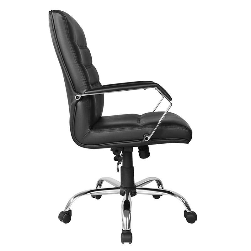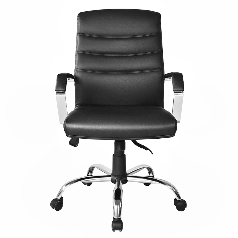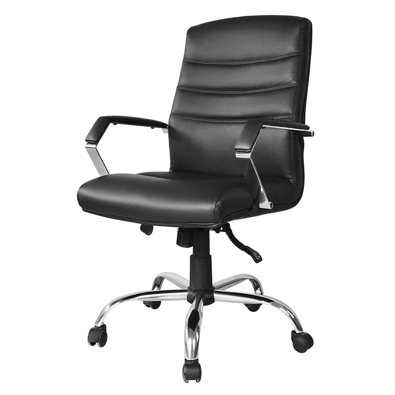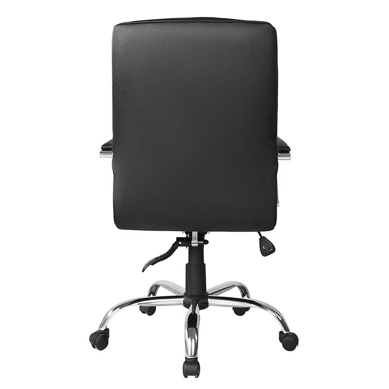Scaunul este tapițat cu piele neagră de înaltă calitate, ceea ce îi conferă un aspect elegant și profesional. Scaunul și spătarul căptușite oferă un plus de confort, făcând confortabile sesiunile prelungite de ședere ale oamenilor. Cu un spătar înalt, scaunul oferă un suport lombar bun, reducând riscul de dureri de spate și disconfort.